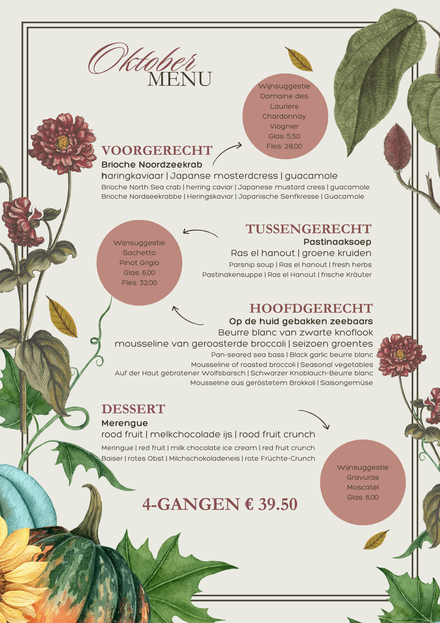 Pastinaaksoep | Ras el hanout | groene kruidenWijnsuggestie Sachetto Pinot Grigio Glas: 6,00 Fles: 32,00